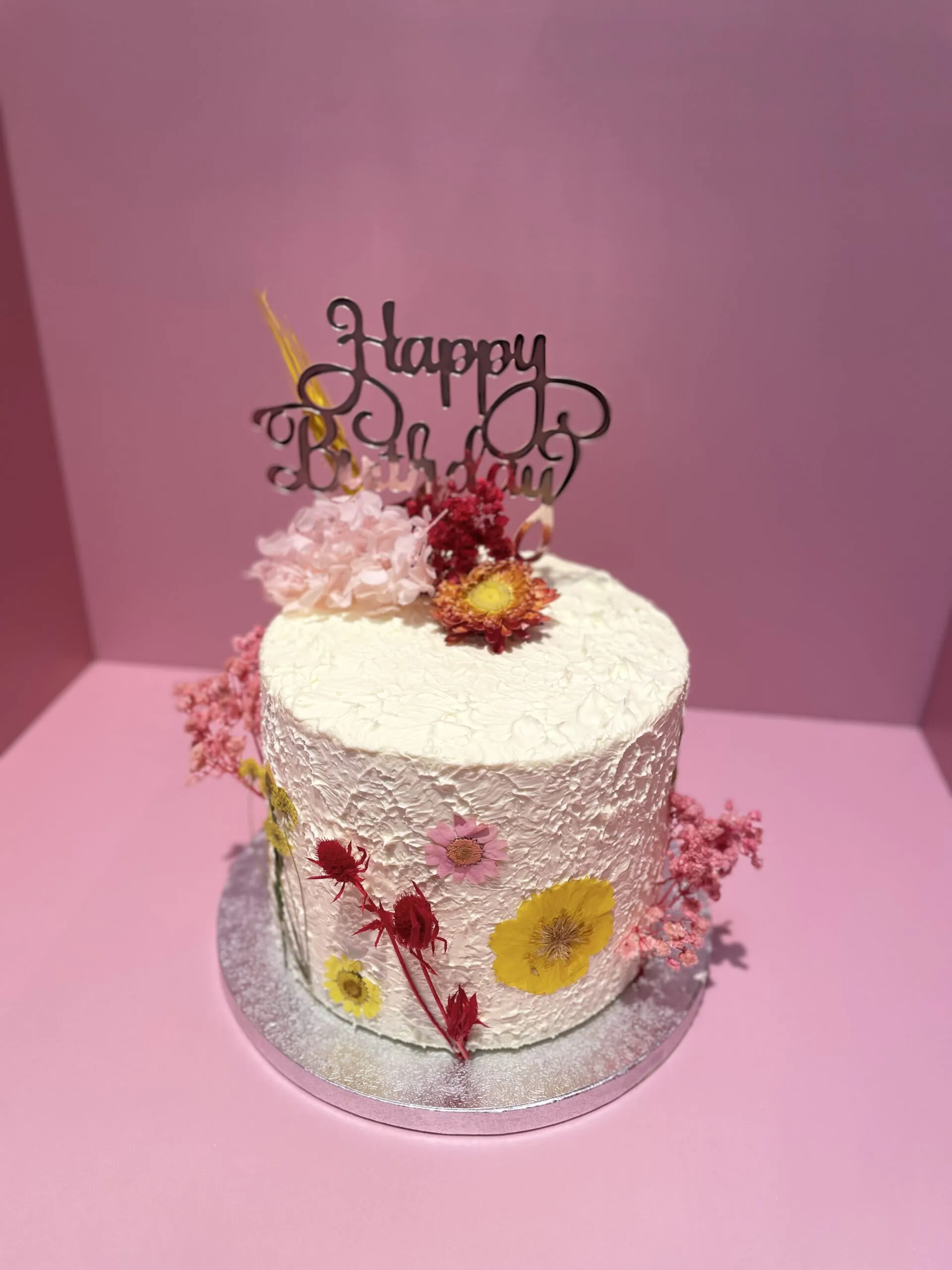 Nog een variatie op de Flower Cake! Dit keer met mooie gedroogde bloemen. De bloemen zijn helaas niet eetbaar dus deze moet je wel voor het aansnijden verwijderen maar daarvoor heb je wel een hele speciale taart die feest echt af maakt!